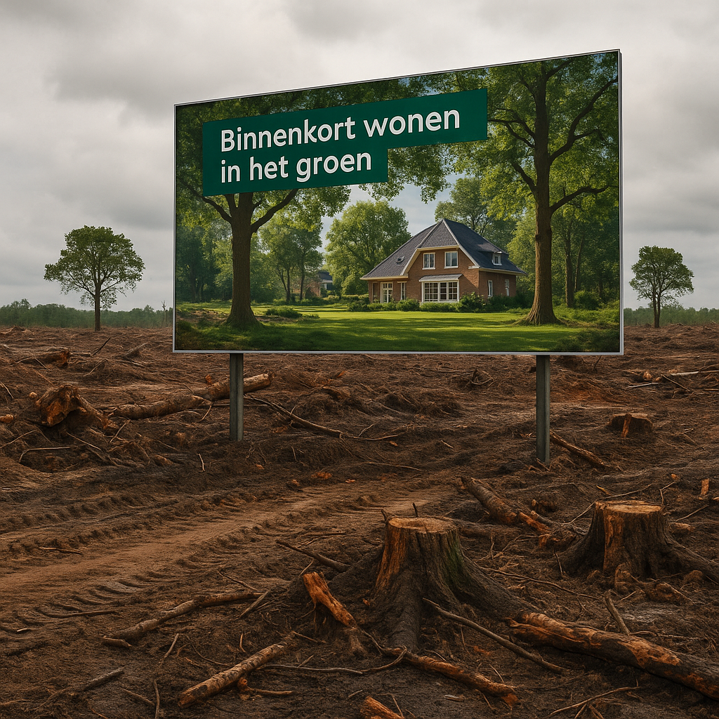 Wonen in het groen is populair, maar wat als de bomen eerst gekapt moeten worden om het bouwproject te realiseren? De nieuwe aanplant heeft decennia nodig om het ideaalbeeld van het reclamebeeld te benaderen.